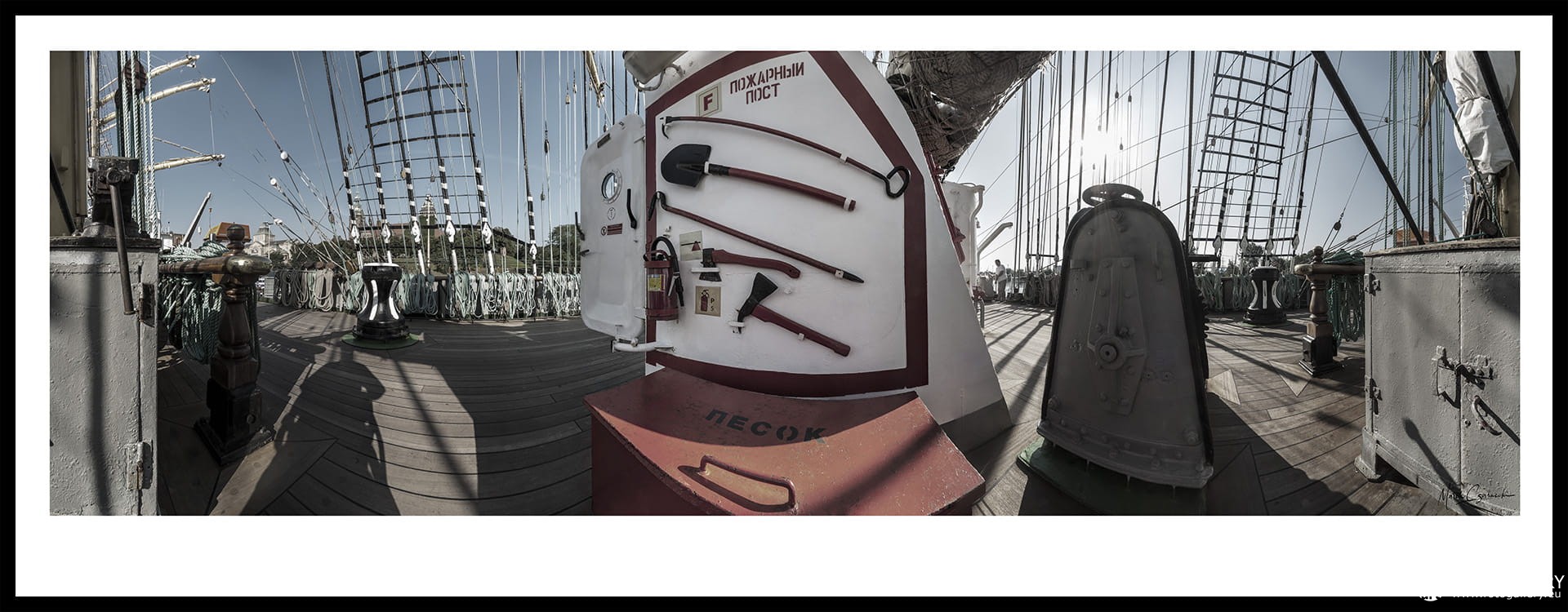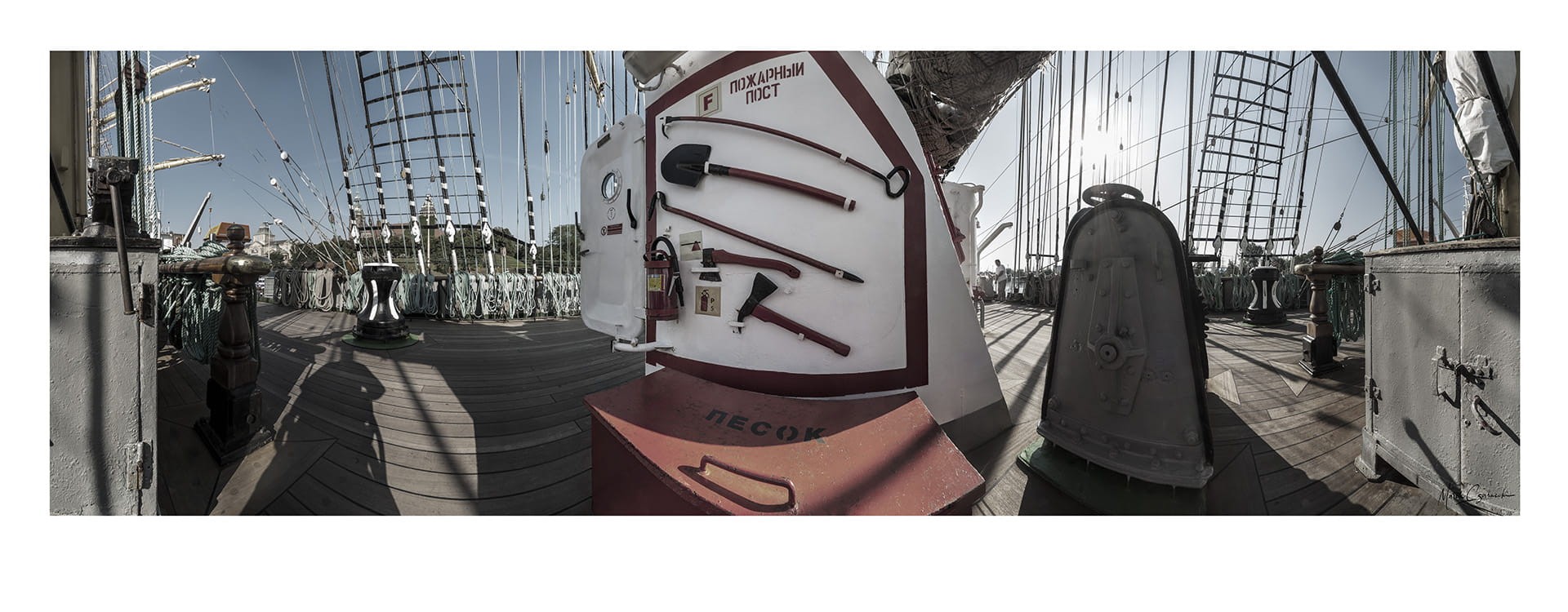 Unikalna fotografia panoramiczna przedstawiająca pokład jednego z największych żaglowców, czteromasztowy rosyjski żaglowiec STS Kruzensztern. Żaglowiec zbudowany w 1926 w stoczni J. C. Tecklenborg w Wesermünde dla Ferdynanda Laeisza. Pływał pod nazwą „Padua” jako żaglowiec towarowy. 12 stycznia 1946 został przekazany ZSRR jako odszkodowanie po II wojnie światowej. Obecnie pływa jako statek szkolny. „Padua” była ostatnim zbudowanym w historii wielkim żaglowcem handlowym. Gdy znalazł się pod banderą radziecką otrzymała imię Iwana Kruzenszterna, dowódcy pierwszej rosyjskiej wyprawy dookoła świata podjętej w latach 1803-1806 na statkach "Nadieżda" i "Newa".