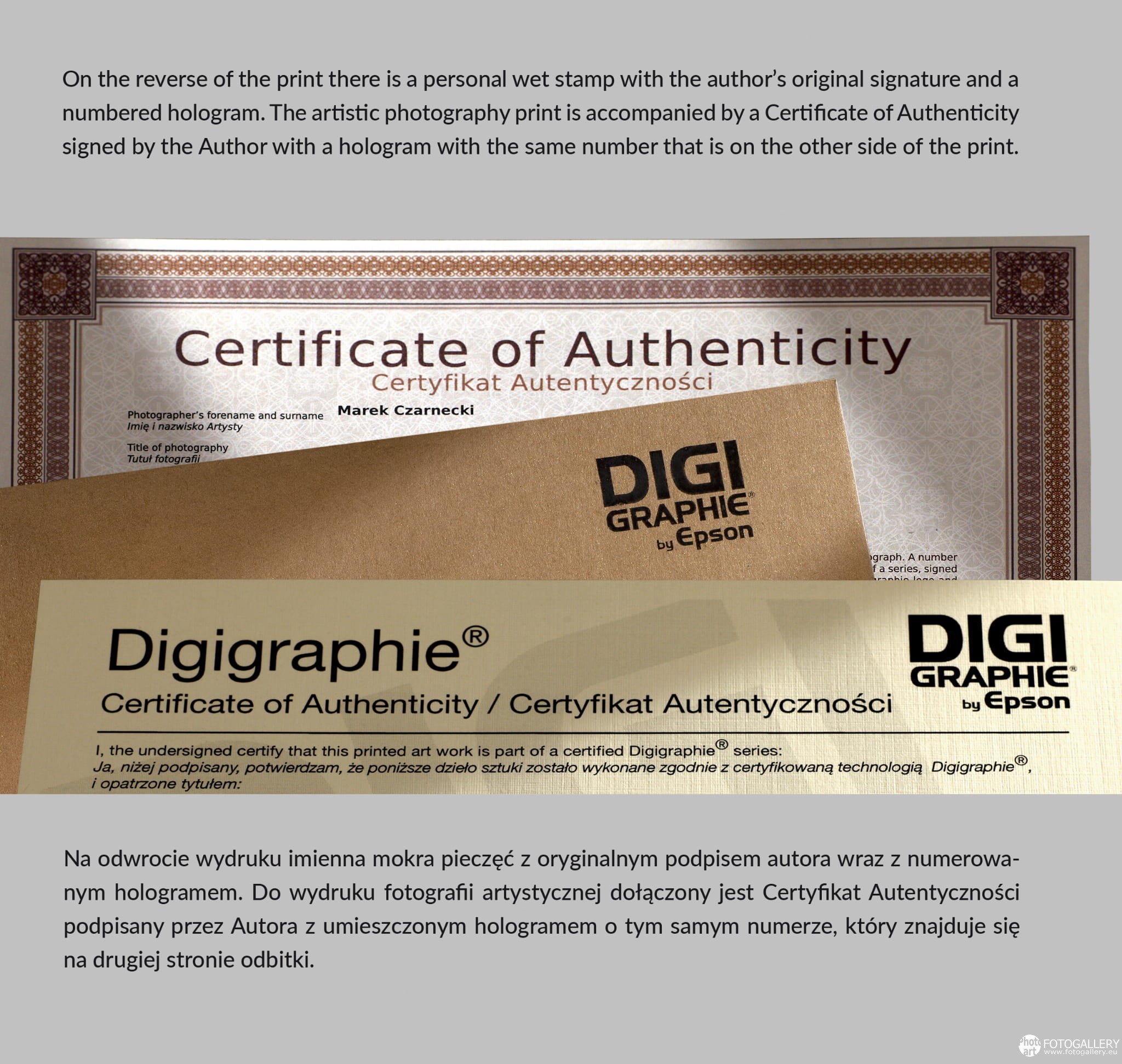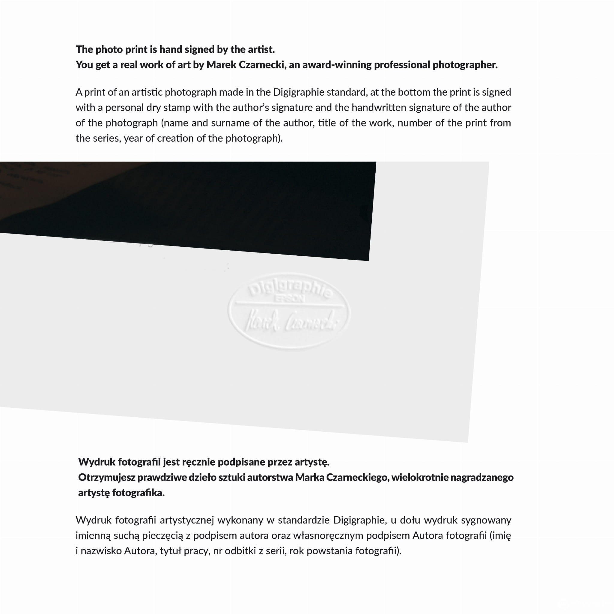 Każda fotografia kolekcjonerska ma dołączony Certyfikat Autentyczności, który poświadcza autentyczność wykonania przez artystę wydruku fotografii limitowanej edycji do celów kolekcjonerskich. Nadany przez autora numer jest gwarancją ilości fotografii występujących w danej serii i formacie.